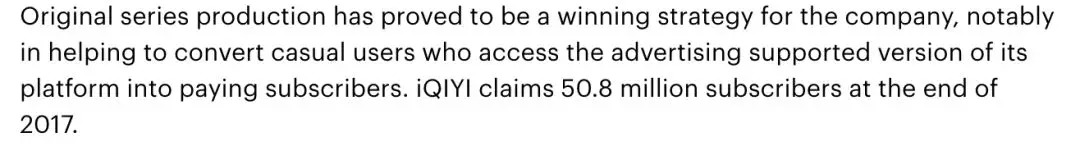 美国最著名和权威的电影杂志Variety(《综艺》)也报道,爱奇艺原创内容是其制胜战略的核心,是其超越其他竞争者的特质,可以帮助平台从依附广告转变到付费用户模式。
