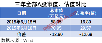 截至2018年6月18日,三年来A股总市值蒸发了12.9万亿元。目前工商银行A股市值为2.03万亿元,相当于蒸发了近6个半工商银行。