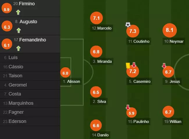 先来看巴西和瑞士的比赛,这场比赛最终结果是1比1,在赛后的评分中,曾经效力中超的保利尼奥获得了5.9的最低分,也是巴西队中唯一一名不及格的球员。替补上场的3名球员也都没有高分,奥古斯托还好,6.3分。其实,保利尼奥的几次前插效果还不错,但都没有能够破门。