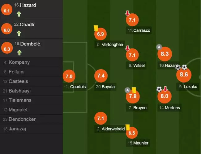 再来看比利时的比赛,评分方面,卡拉斯科7.1分,维特塞尔7.1分,这个评分都中规中矩,但是比利时三叉戟评分都超过8分,此外,卡拉斯科和维特塞尔都被换下。