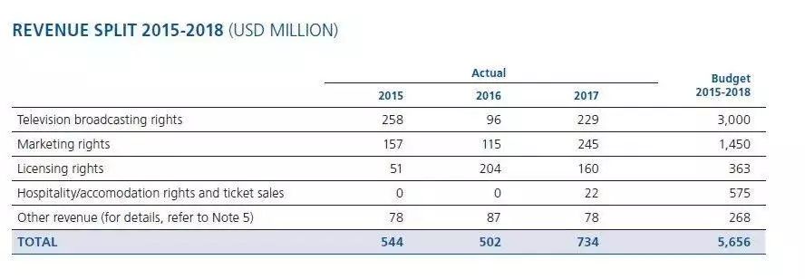 在3月18日发布的FIFA 2017财政报告中,国际足联2017年在全球范围内的收入总额为7.34亿美元,其中电视转播权的收入为2.29亿美元;营销收入超过电视转播权的收入,为2.45亿美元;FIFA周边产品授权的收入也已高达1.6亿美元。