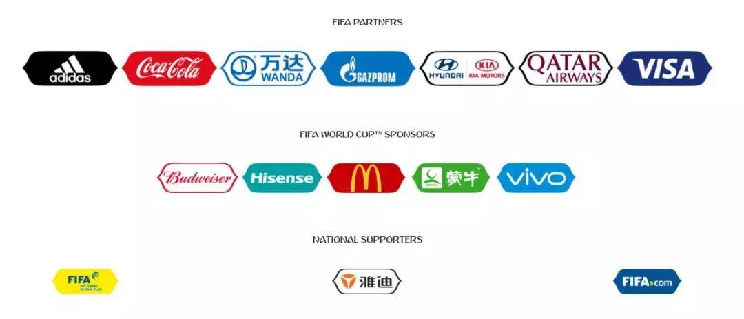 2018年,国际足联已构建了战略、世界杯与地域等三级赞助商模式。根据尼尔森6月11日发布的《2018年世界足球报告》(World Football Report 2018),本届俄罗斯世界杯,国际足联已入账14.5亿美元的赞助费。值得一提的是,在俄罗斯世界杯上,中国企业在上述三级赞助栏位上都占据了重要位置,万达、海信、蒙牛、vivo、雅迪等中国企业将在资金、产品与服务上为世界杯提供全方位的支持。