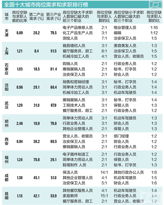 区域需求方面,报告列出的全国十大城市中,郑州最缺工,岗位空缺与求职人数比率达2.46,最缺简单体力劳动人员和行政业务人员。而天津岗位空缺和求职人数比率最低,仅为0.89,市场供大于求。