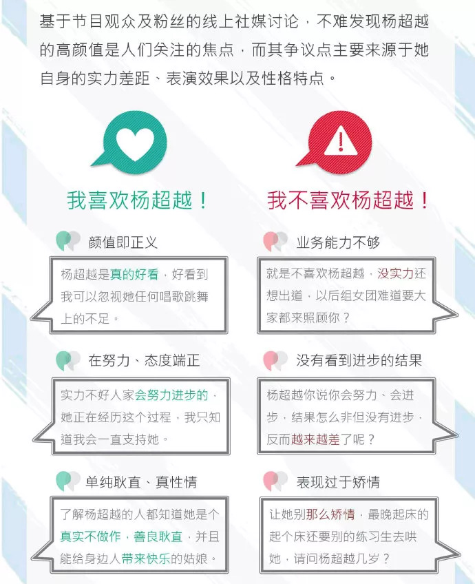 第四、杨超越在每一期节目中的亮相都会引发 diss 杨超越的路人观众的负面情绪爆发。也就是说杨超越每出现一次,都在提供着新的素材供路人 diss ……不过这也不一定会导致她人气下滑,钢铁直男研究院把微博上的评论做了一个统计,在他们选取的“村民”样本中,有7%的人是因为太多人 diss 杨超越而爱上了她……