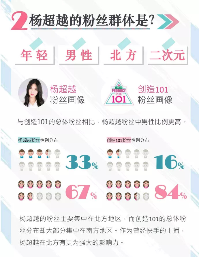 第二、杨超越的粉丝以年轻群体、男性、北方人为主,粉丝更多关注二次元内容,更喜欢看流量明星参演的影剧作品。