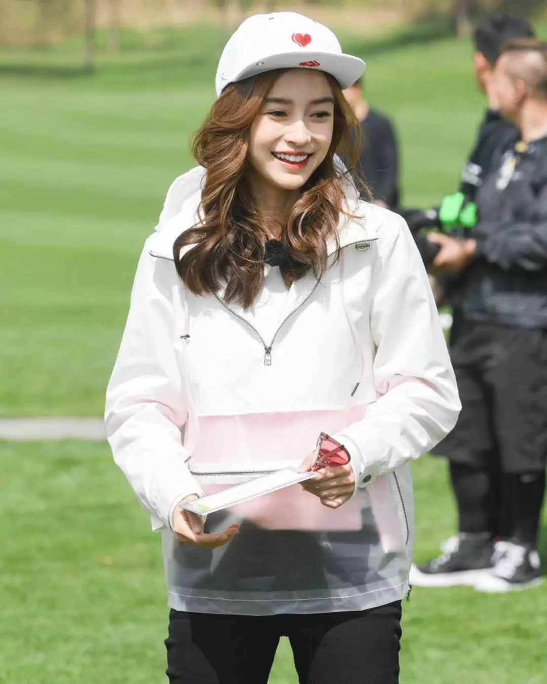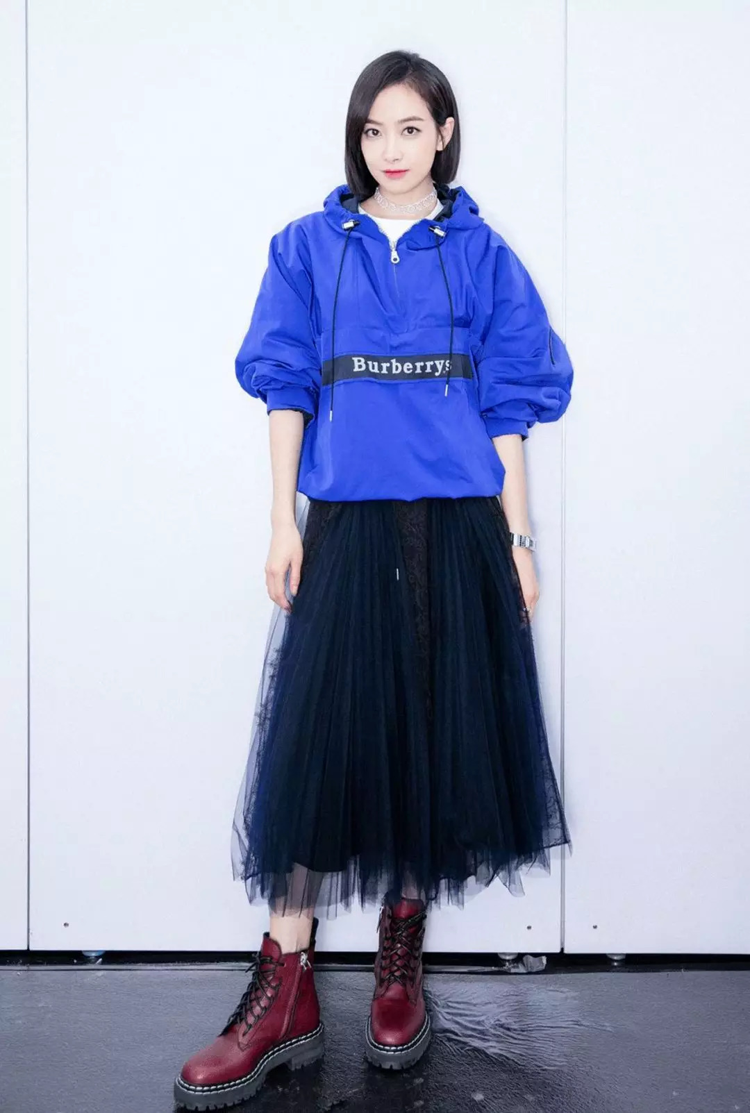 当然并不是每个人都喜欢嘻哈风,想低调一点,又喜欢这个款式的客官,可以参考Angelababy,配一条黑色紧腿裤和工装帽,简单又很时髦。