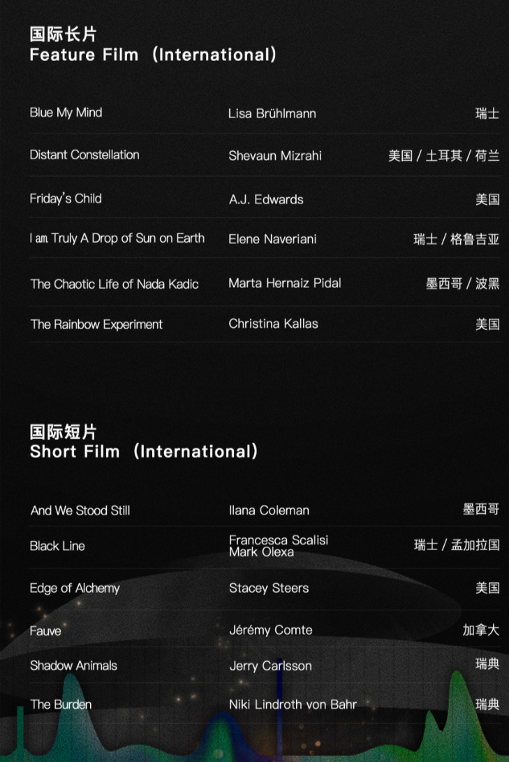 国际部分,《The Rainbow Experiment》以分屏形式探索叙事的多样与模糊,《Distant Constellation》是唯一一部国际纪录长片,在简单的影像与叙事中直面孤独的人生。两部同样探讨少年成长的影片《Friday’s Child》 与《Blue My Mind》遥相呼应。
