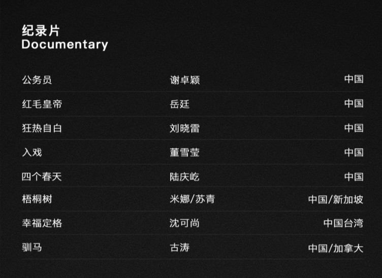 纪录片方面也有相对宏观的领域,董雪莹执导的《入戏》,利用戏中戏的结构,对集体主义进行反思。谢卓颖执导的《公务员》,也用群像式的白描了80名参加公务员考试的考生的考前培训的过程,折射出当代年轻人集体面对生活选择的困境。