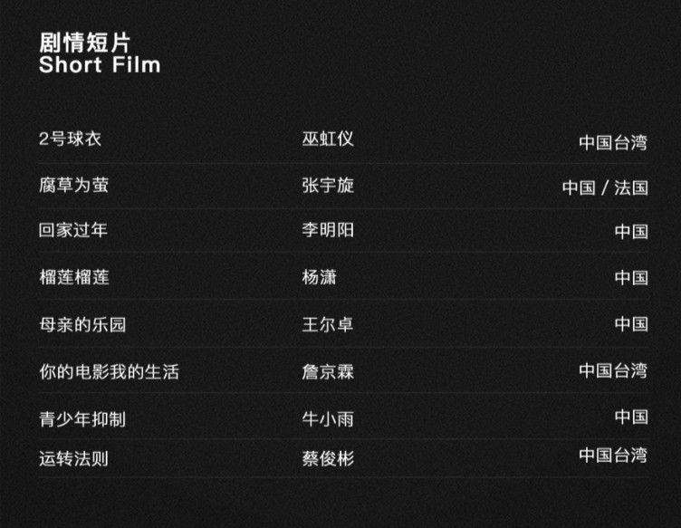 此外,8部入围的短片中,既有作者风格强烈的《榴莲,榴莲》,也有视觉想象力极强的《青少年抑制》,还有关注中产知识分子精神境遇的《你的电影我的生活》。