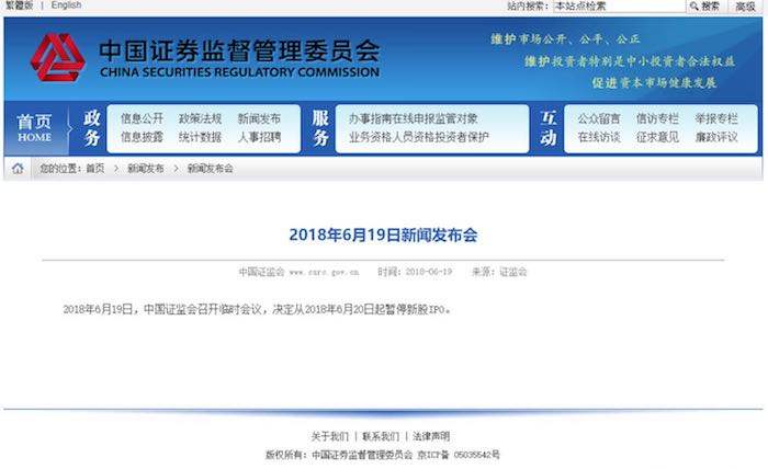 然而记者查阅证监会官网发现,并没有所谓6月19日新闻发布会或有关暂停IPO的公告。