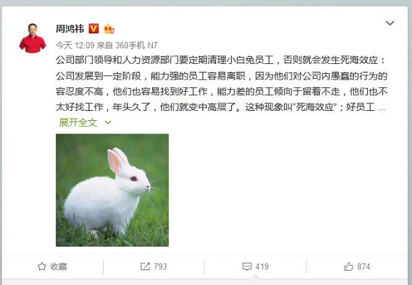 最近,360集团董事长周鸿祎就在个人微博上明确表态,为了避免发生死海效应,公司部门领导和人力部门要定期清理小白兔员工。