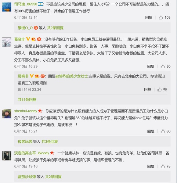 尽管不少网友认同了这一观点,周鸿祎的这番言论还是引发了不小争议。在质疑方看来,不着重强调改善公司愚蠢行为留住好员工,而是选择把刀指向了没有功劳也有苦劳的白兔们,可谓抓错了重点。