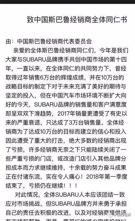 6月19日,一封《致中国斯巴鲁经销商全体同仁书》,揭开了斯巴鲁在华所面临困境。2017年销量遭受了有史以来的严重衰退,只达成了3万台销售量,绝大多数经销商出现亏损,许多经销商陆续关闭了一些严重亏损的门店。而且2018年第一季度结束,亏损仍在继续。