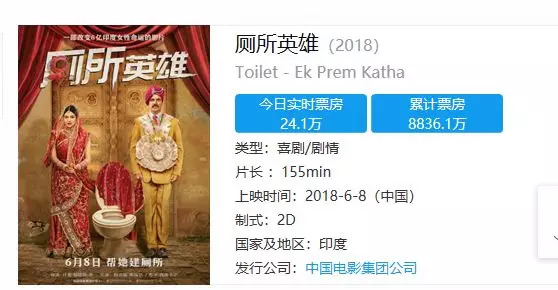 6月开始,另外一部在印度国内和西方世界也颇受好评的影片《厕所英雄》来袭,此片在印度本土的票房收入超过10亿卢比(人民币近1亿元),位列有印度年度票房榜前十,也算是口碑佳作。在国内是6月8日上映,同期没有好莱坞超级大片,只有一些国产电影的竞争,只可惜《厕所英雄》的命运似乎和《巴霍巴利王2:终结》如出一辙。影片在开局排片超过15%的情况下迅速下落,最终一周之后排片已经跌到1%左右,累计票房也停止在8900多万左右。这部影片还是由中影引进发行,享受的是好莱坞大片的待遇,但是回报却只是“宝莱坞”的真实等级。