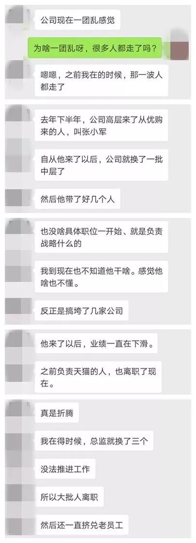 关于阿芙将被收购一事,这位前员工表示,“大家都知道要卖,但没想到是被收购,之前说想上市,真没想到这么快。”据Ta透露,现在阿芙内部“比较乱”、“员工离职率很高”。去年下半年,原优购网COO张小军来到阿芙高层,并且带了好几个人。此后,阿芙内部就换了一批中层,天猫的负责人、市场部负责人等相继离职,人事一度动荡。