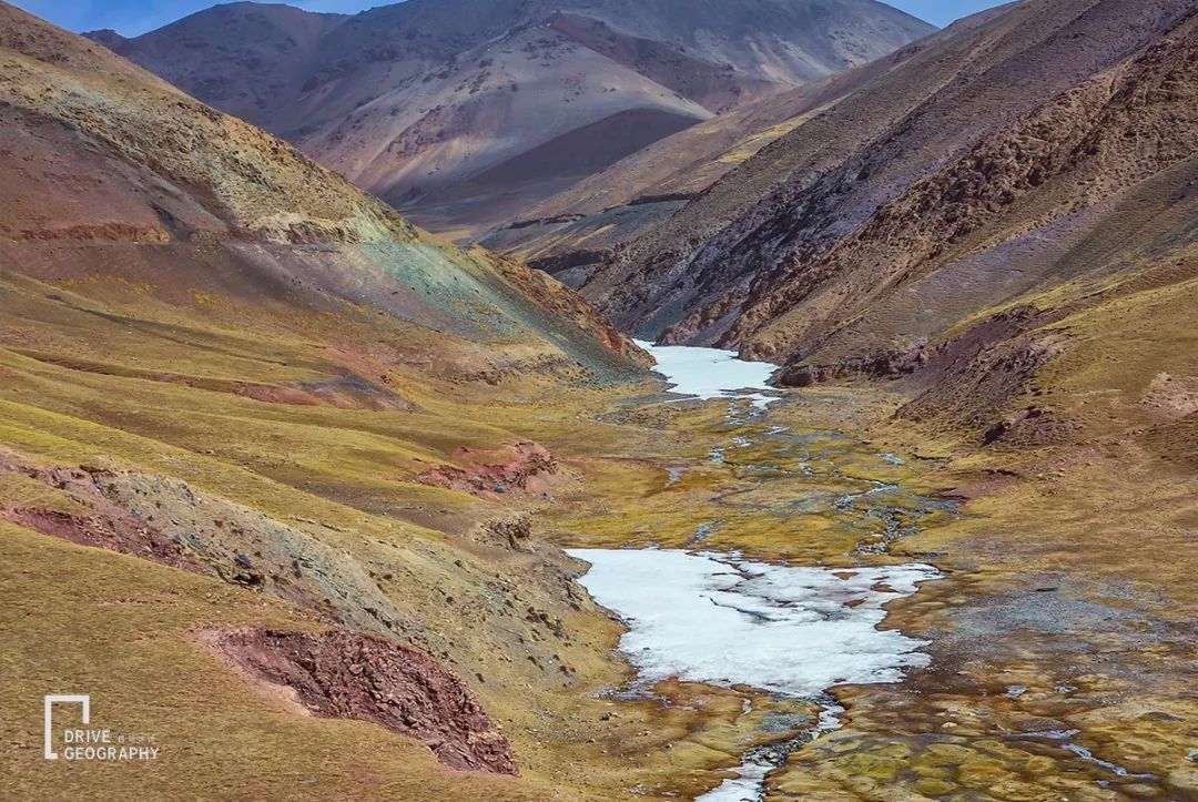 进入哈拉湖周边的盆地区域,这里的所有海拔都在4000米以上,人迹更加罕至,本来因为时间不足,想走湖东北的一条近道,不过走了一段后,发现河沟里大石头众多,目前车辆底盘无法通过,想从山坡上绕行河谷,最后发现落差太大无法走通。