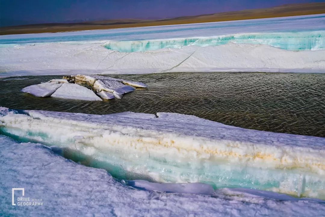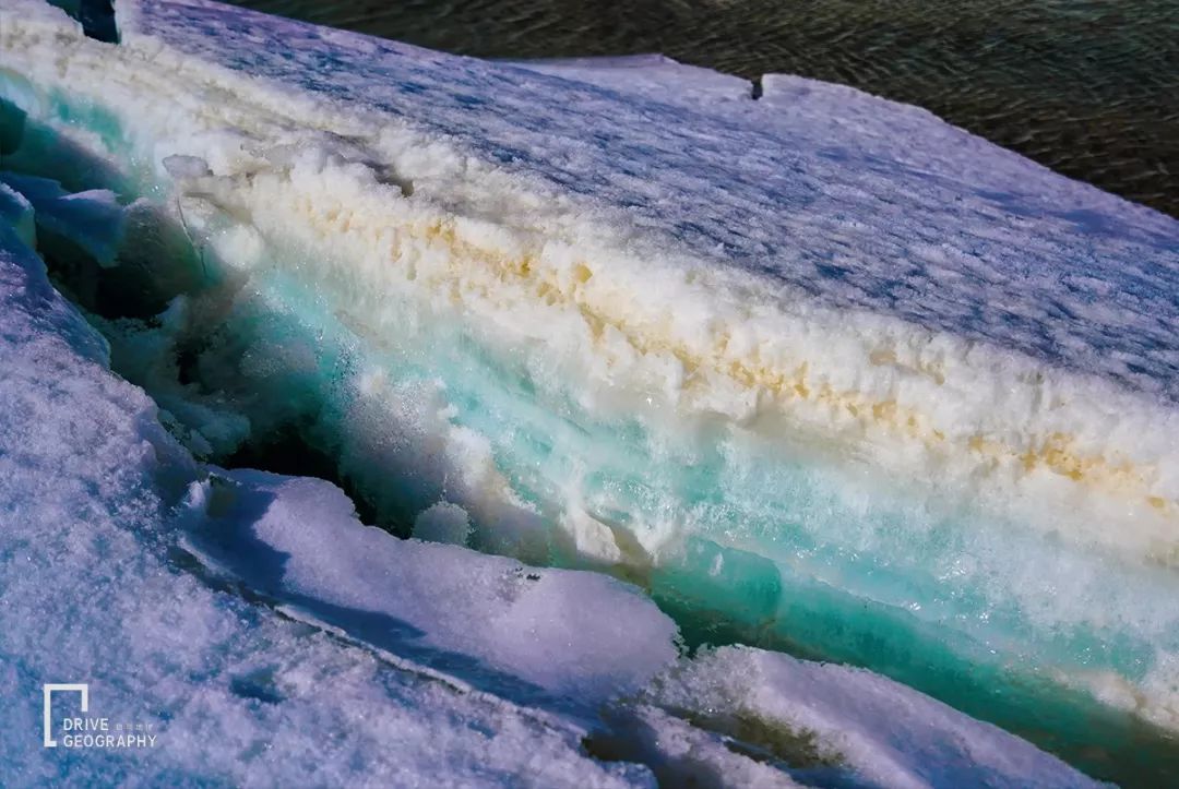 反复跨越了多条冰河,历经了许多越野磨难之后,车队终于到达了哈拉湖边,看到了那分层的蓝色冰块,冰块的上层是积雪的堆积,而下层是密度很高的蓝色冰块,它们在夕阳的照耀下晶莹闪闪。
