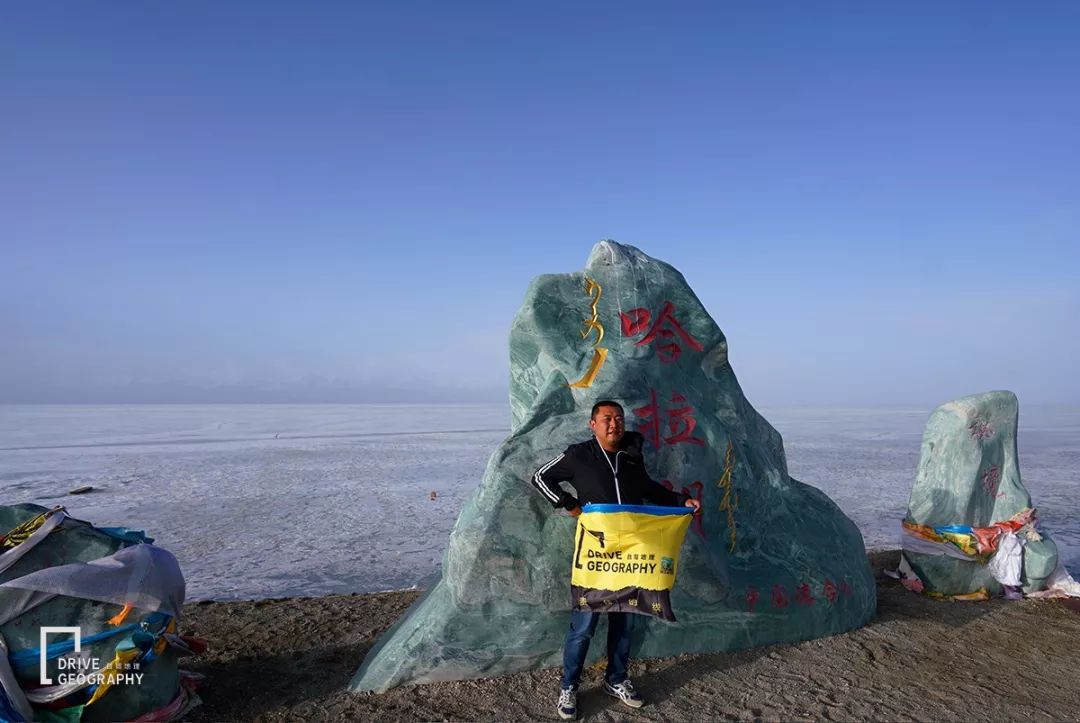在游客中心的湖边,有三块巨大青玉雕刻的拍照留念地,哈拉湖文字那块玉石真是巨大,背后就是一望无际冰封的哈拉湖,目前湖面还在解冻,所以还看不到碧蓝如玺的神奇湖水。