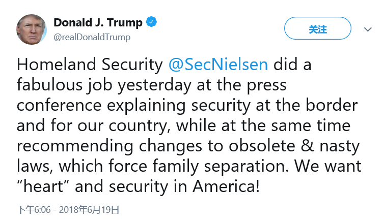 特朗普在周二与小企业主的会议上说:“我们应该停止分离家庭,但我们不能让人就这么涌进来。我们需要民主党人支持解决问题。”同时他还在推特上表示:“国土安全部部长尼尔森昨天在新闻发布会上很好地解释了边境的安全情况。他还建议,我们应该改变将孩子和家庭分离的过时和卑鄙的法律。我们想要即有心又有安全的美国!“