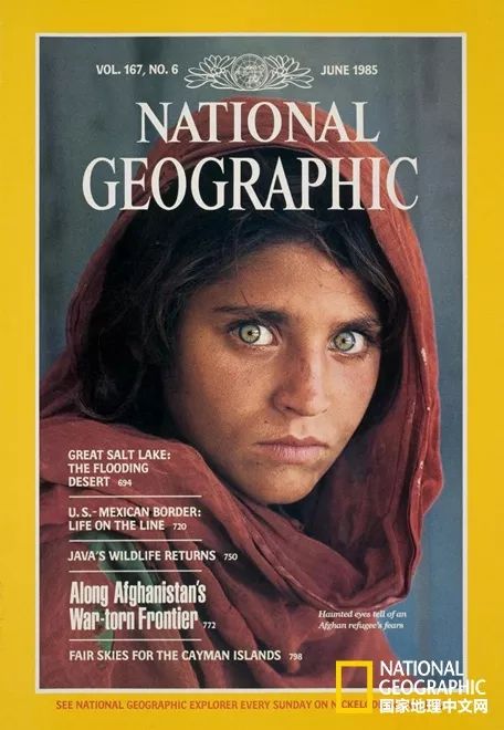 1985年6月号的“阿富汗女孩”封面,被誉为《国家地理》创刊以来最具辨识度的封面。沙尔巴特•古拉深邃的眼眸和冷峻的表情,让其经常与《蒙娜丽莎》相提并论。