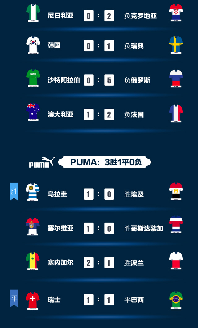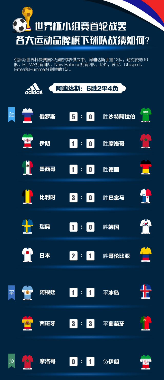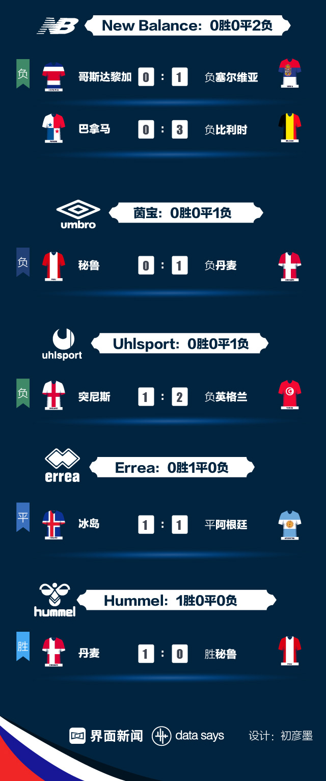 此外,PUMA旗下的四支球队3胜1平,New Balance则两队皆负。而四个手握独苗的运动品牌中,Hummel凭借丹麦击败秘鲁获得一胜,Errea旗下的冰岛1-1逼平阿根廷,茵宝和Uhlsport均遭遇一场失利。