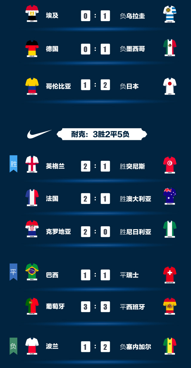 夺冠赔率榜单上排名前五的球队,分别是巴西、德国、西班牙、法国以及阿根廷,除了法国队靠VAR视频助理裁判和门线技术以2-1小胜澳大利亚,巴西、西班牙和阿根廷均以平局收场。为此,耐克与阿迪达斯两大巨头领衔的大牌球队,均无特别的突出表现。
