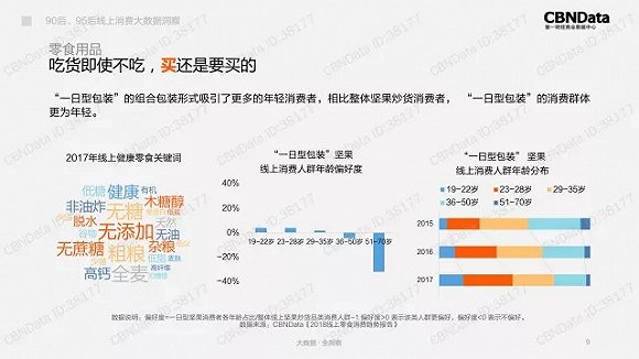 健康运动,也要健康地吃。CBNData《报告》显示2017年线上健康零食的关键词都聚焦在无添加、无蔗糖、无糖,而且一日型的包装更吸引他们。