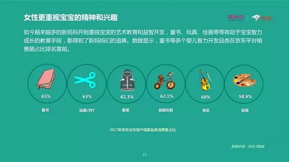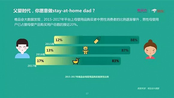 随着社会分工渐渐改变,男性开始回归家庭,女性则更注重寻找自我。 2015-2017年平台上母婴用品购买者中男性消费者的比例逐渐攀升,而女性更重视宝宝的精神和兴趣,也选择用旅行度假、图书让自己变得更加优秀。