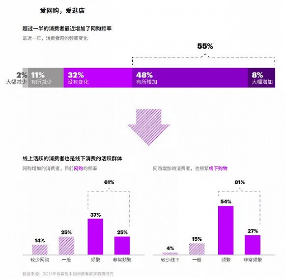 网购持续发展,实体店也在逐渐完善。线上购物虽然方便,但实体店的消费更强调体验。报告提到,线上活跃的消费者也是线下消费的活跃群体。