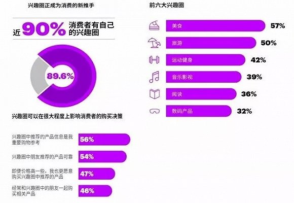 研究显示,近九成消费者有自己的兴趣圈子,以美食、旅游、运动健身等最为普遍。在这样的圈子经济下,他们越分享、越冲动、越爱购。