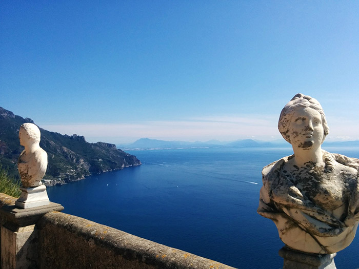 我们在一条名为浩瀚大道(Avenue of Immensity)的路径上漫步。庄园各处都有希腊与罗马神的雕像,包括谷神刻瑞斯、信使神墨丘利和处女守护神狄安娜,还有酒神巴克斯的庙宇(对应的希腊神祗名为德墨忒尔、赫尔墨斯、阿尔忒弥斯和狄奥尼索斯——译注)。格里姆索普男爵生前曾要求将自己的骨灰葬在此处。我们顺着地图的指引上到了无限阳台(Terrace of Infinity),这里可以俯瞰无边的大海。18世纪的大理石半身像围着阳台边上整齐排列,你可以从这里看到阿马尔菲海岸,过去与当下在此交相激荡,蔚为壮观。放眼望去海天相接,好似天堂与地狱的交汇处。没有比这更好的追忆逝者的去处了。