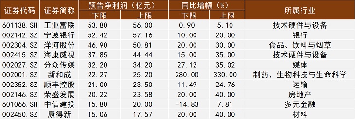 在实现盈利的上市公司中,工业富联(601138.SH)、宁波银行(002142.SZ)、洋河股份(002304.SZ)、海康威视(002415.SZ)、分众传媒(002027.SZ)等17家上市公司今年上半年净利润将超10亿元。