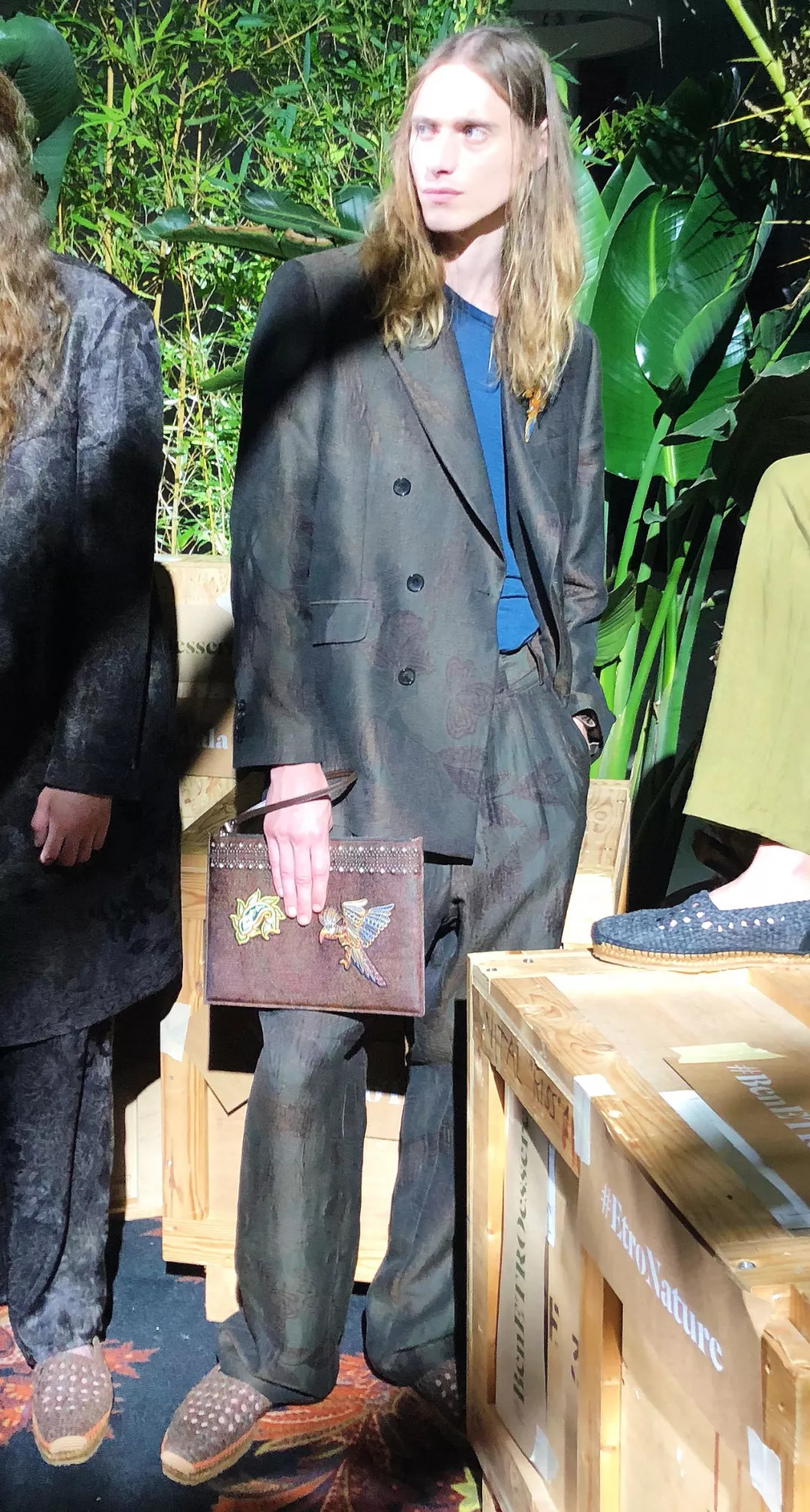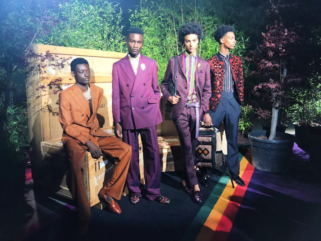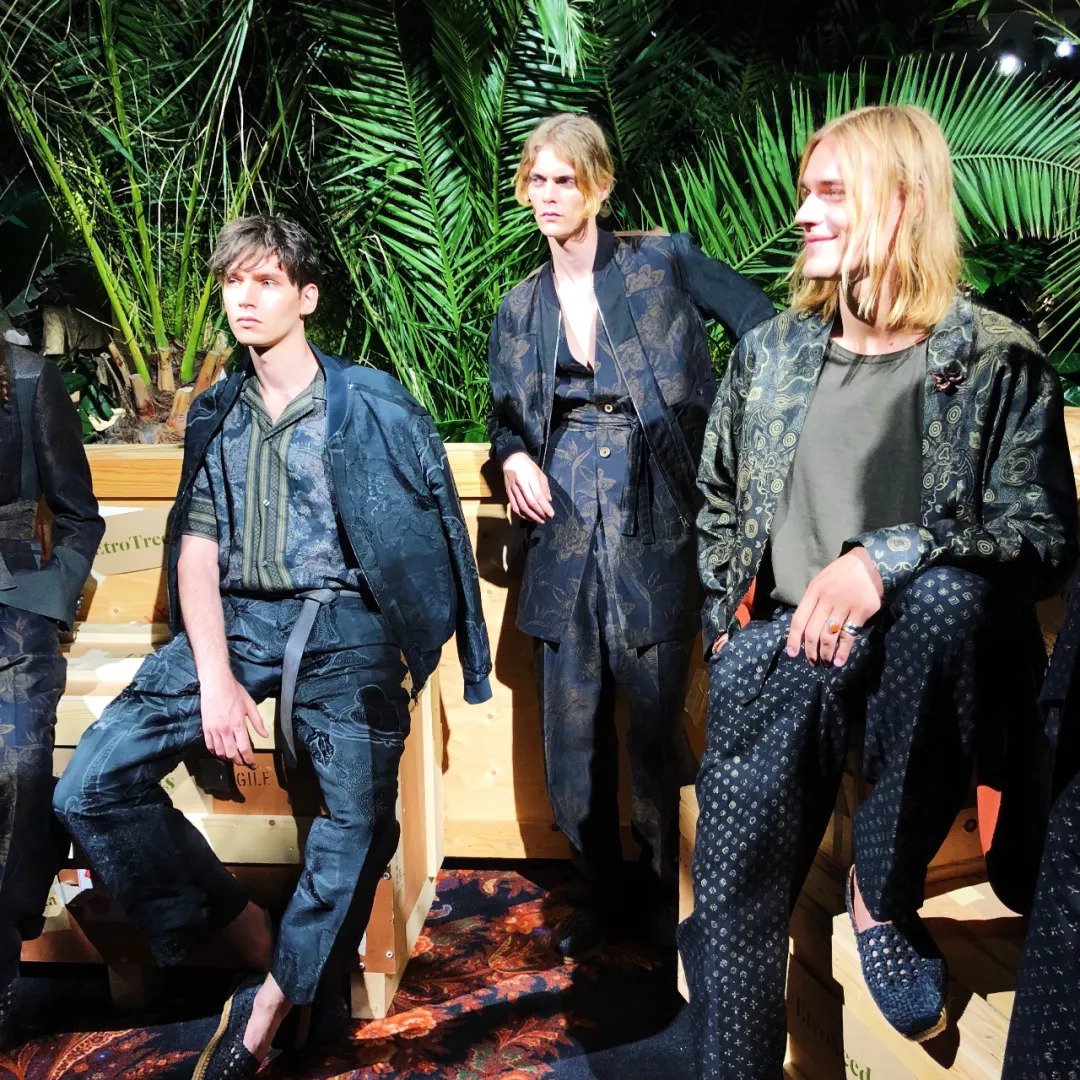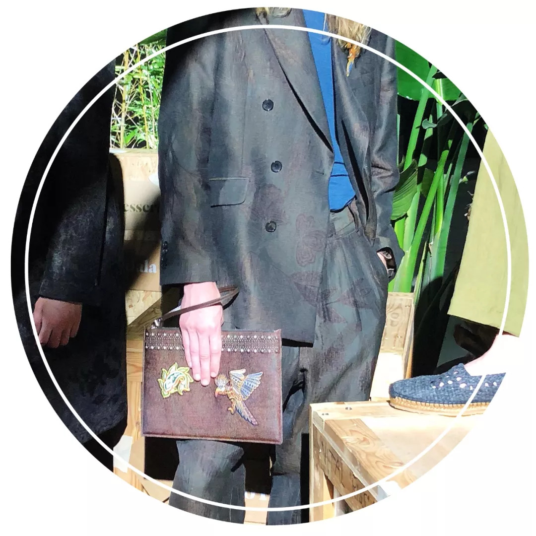 Etro一直都带有浓郁的民族风情,所以它的服饰一眼就能认出;这一季看到了天然纤维、植物染料和带有东南亚、印度尼西亚、非洲、日本等各种图形面料。今年的西服特别宽松修长,搭配20世纪30年代的复古厚褶皱阔腿裤,风度翩翩。西装浓郁饱满的精美印花、西裤边上手工染色丝带,Etro的单品一定要走近细看才能感受做工的精致。如果你是一个风情万种的先生,Etro是最值得拥有的单品。