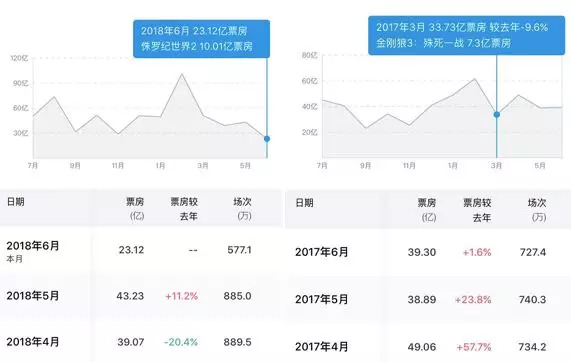从整体影片数量来看5月是不到40部,而6月适逢暑期,又正好有儿童节和端午节,所以整体上映电影数量并不少。但从整体票房看确实是下降趋势,2017年5、6月份的票房都是39亿左右,而上个月的票房是43.23亿,比去年上涨11%,本月目前23亿,时间上还有十天,即便后面《超人总动员2》和《动物世界》有所发挥,恐怕整体表现也会差强人意。