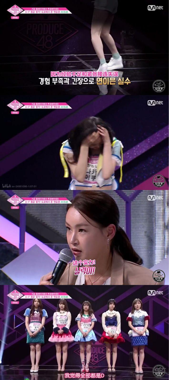 日本首次登场的组合刚表演结束,因为舞蹈动作不熟练、唱歌跑调等状况,遭到了导师直言不讳的diss。曾经在AKB选举中拿到舞蹈第一的中野郁海练习生,在舞蹈solo环节做了几个动作之后就直接选择了放弃,挫败感让她沮丧的低下了头。