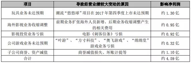 其三,国内投资并购不理想。收购叶游等游戏公司组建而来的奥飞游戏造成了0.32亿元的亏损,投资收购的魔屏漫画等公司衰退也带来1.1亿元的商誉和资产减值。