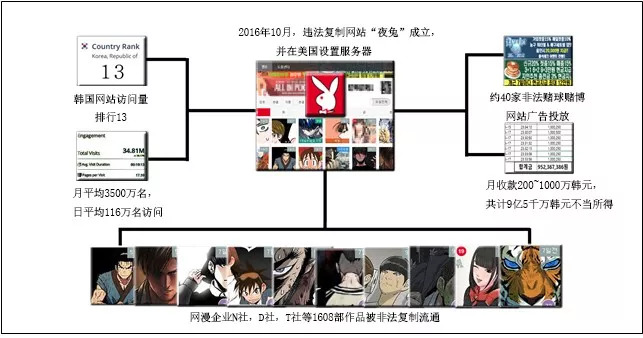 作品的非法流通给韩国网络漫画产业带来了很大的损失,数据显示,2017年韩国网络漫画市场的规模为7240亿韩元,仅“夜兔”一个盗版网站就带来了超过2400亿韩元的损失。