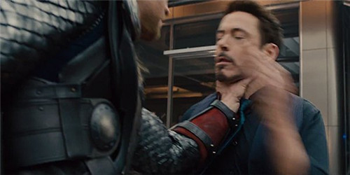 (雷神掐住钢铁侠的脖子并把他举起来)
