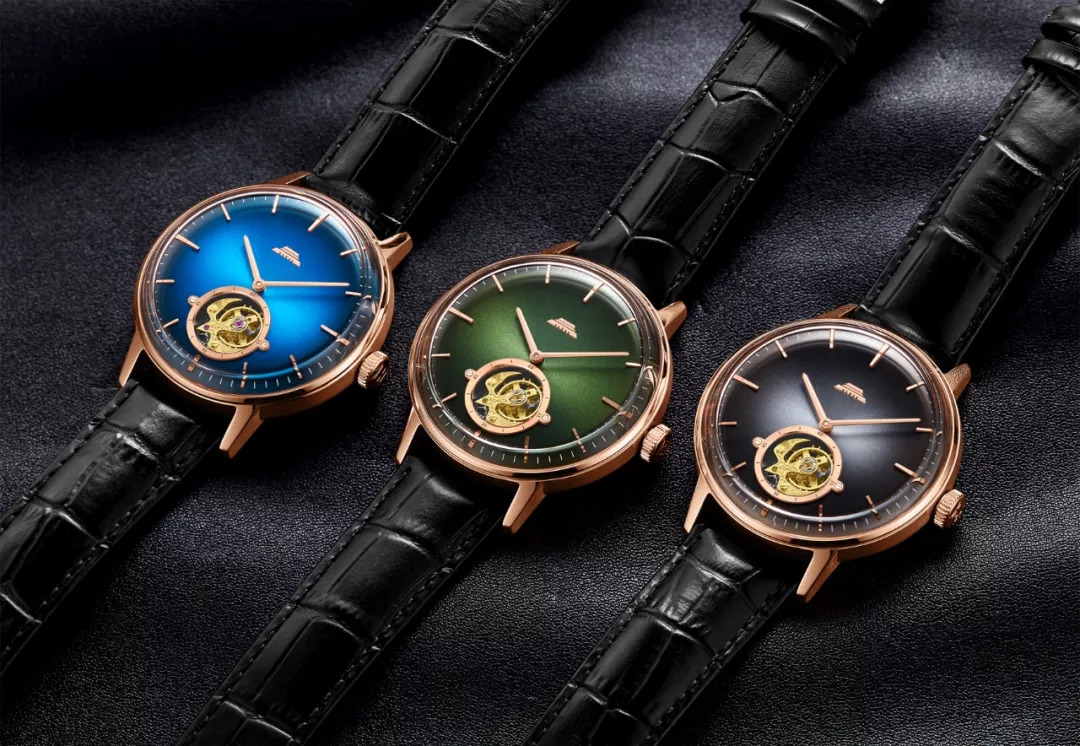 直径43mm;厚度11.35mm;不锈钢表壳IP镀玫瑰金色;各限量300枚;售价:玄色¥22800,天色¥25800,绿沉¥26800
