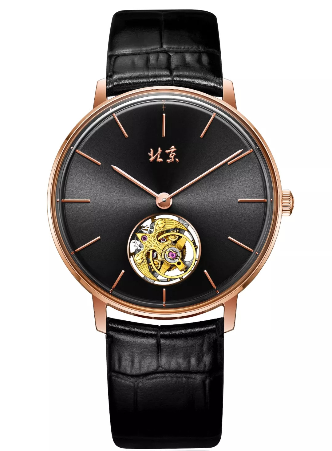 米芾“北京”汉字标识,仅呈现于北京表高端作品,此款超薄陀飞轮腕表为18K玫瑰金表壳,仅限量60枚。