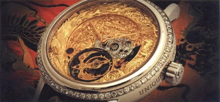 两年以后,北京表把一只名为“游龙戏凤”的金雕陀飞轮腕表带到巴塞尔表展,金雕表盘之外,机芯100多个零件也都进行了全微雕装饰,创下七项纪录;前国务院副总理邹家华先生曾亲笔题字“游龙戏凤,方寸乾坤”。