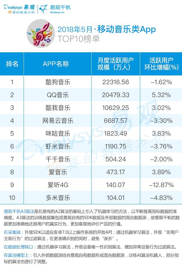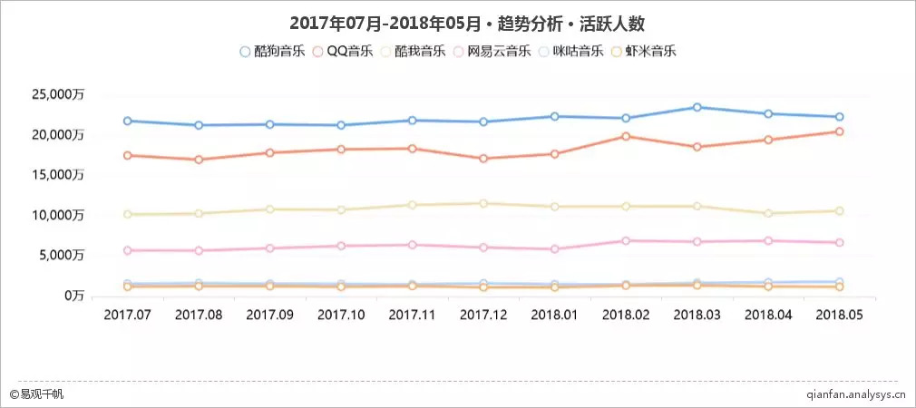 从月活跃用户量这一基础数据指标中也可以得到类似的结论。2018年5月,易观千帆数据显示,腾讯音乐集团旗下酷狗音乐、QQ音乐和酷我音乐三大App稳居移动音乐领域月活量的前三位,领先幅度也相对较大。可以判断,在经历了版权格局的完善和调整之后,腾讯音乐集团旗下的三款产品已经基本站稳了市场头部的位置。