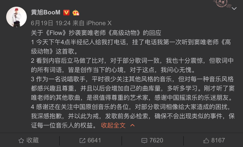 6月19日上午9点13分,黄旭上线了新歌《Flow》,随后窦唯粉丝们发现部分歌词与窦唯的《高级动物》高度相似。