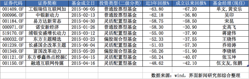 在2015年发行的分级基金中,亏损者超一半。如今这一品种已被叫停,除去分级基金与被动指数基金外,哪些主动型基金也成了“韭菜收割机”?下表为2015年发行的基金中,近三年回报率最低的10只: