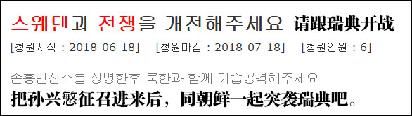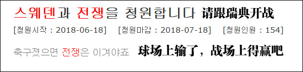 《朝鲜日报》19日报道称,现在针对瑞典和时任主裁的声讨请愿数量已经破了千,本来韩国球迷还想针对下这位裁判的社交媒体账号,奈何韩国人找半天都没有找到,只好来青瓦台的请愿版发泄。