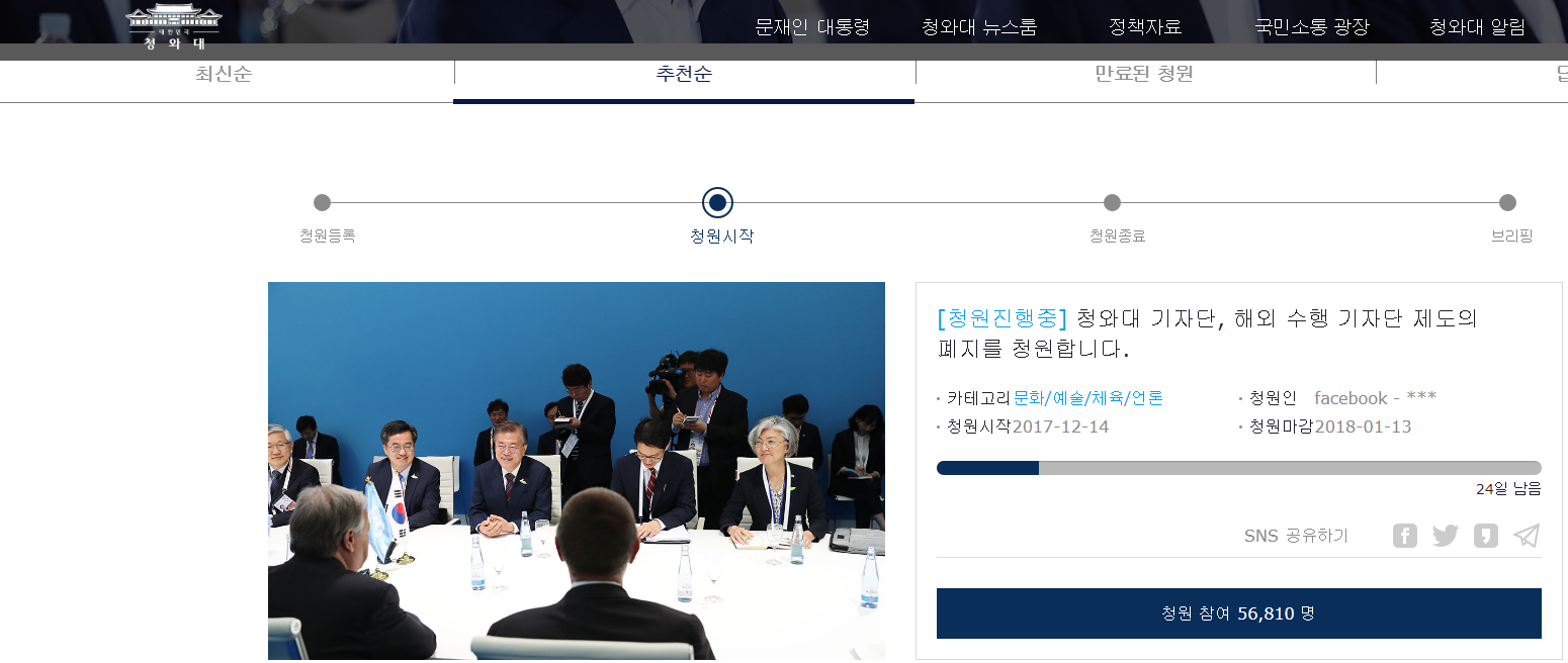《朝鲜日报》称,这是文在寅政府上台后,为及时回答国民的质询而设立的页面。据观察者网此前报道,每当韩国发生舆论热点事件时,在青瓦台的请愿版上往往会有相关的请愿: