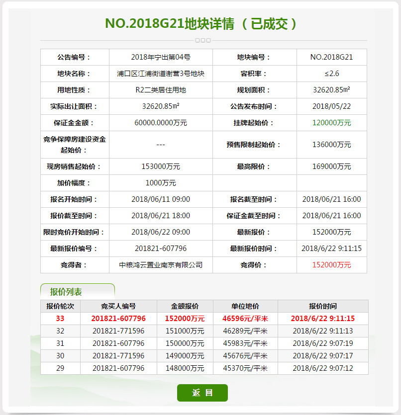 1、江北G21地块,经过33轮竞拍,被中粮鸿云置地南京有限公司以15.2亿元竞得,楼面价17922元/㎡。