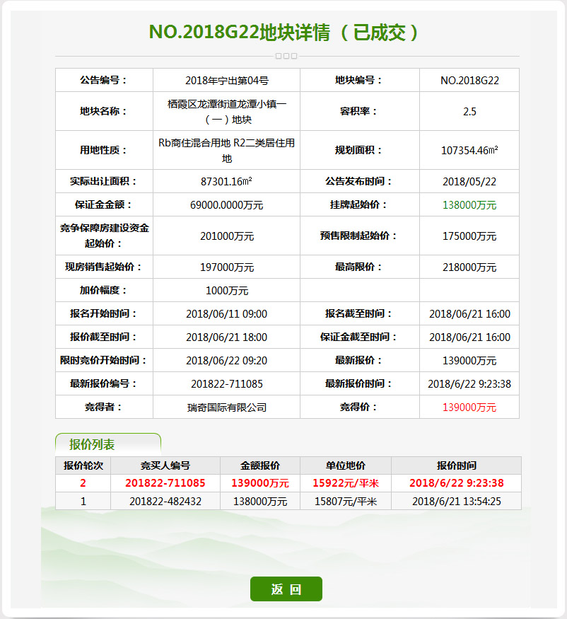 2、龙潭G22地块,经过2轮竞拍,被瑞奇国际有限公司以13.9亿元竞得,楼面价为6369元/㎡。