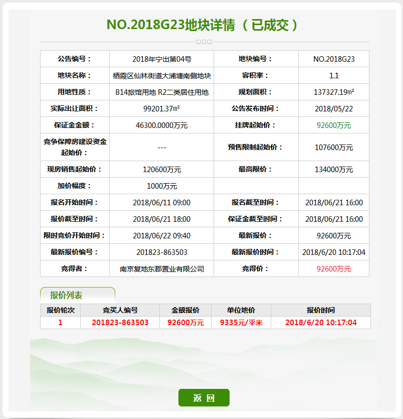 3、仙林G23地块,经过1轮竞拍,被南京复地东郡置业有限公司以底价9.26亿元竞得,楼面价为8486元/㎡。