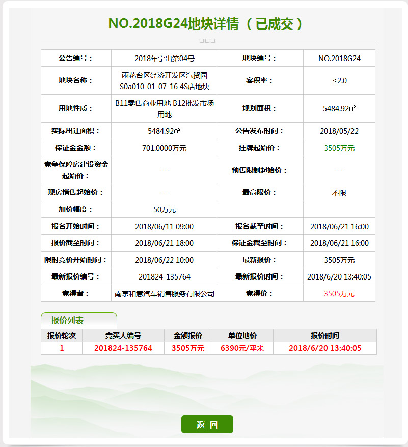 4、城南G24地块,经过1轮竞拍,被南京和意汽车销售服务有限公司以3505万元竞得,地块性质为B11零售商业用地、B12批发市场用地。